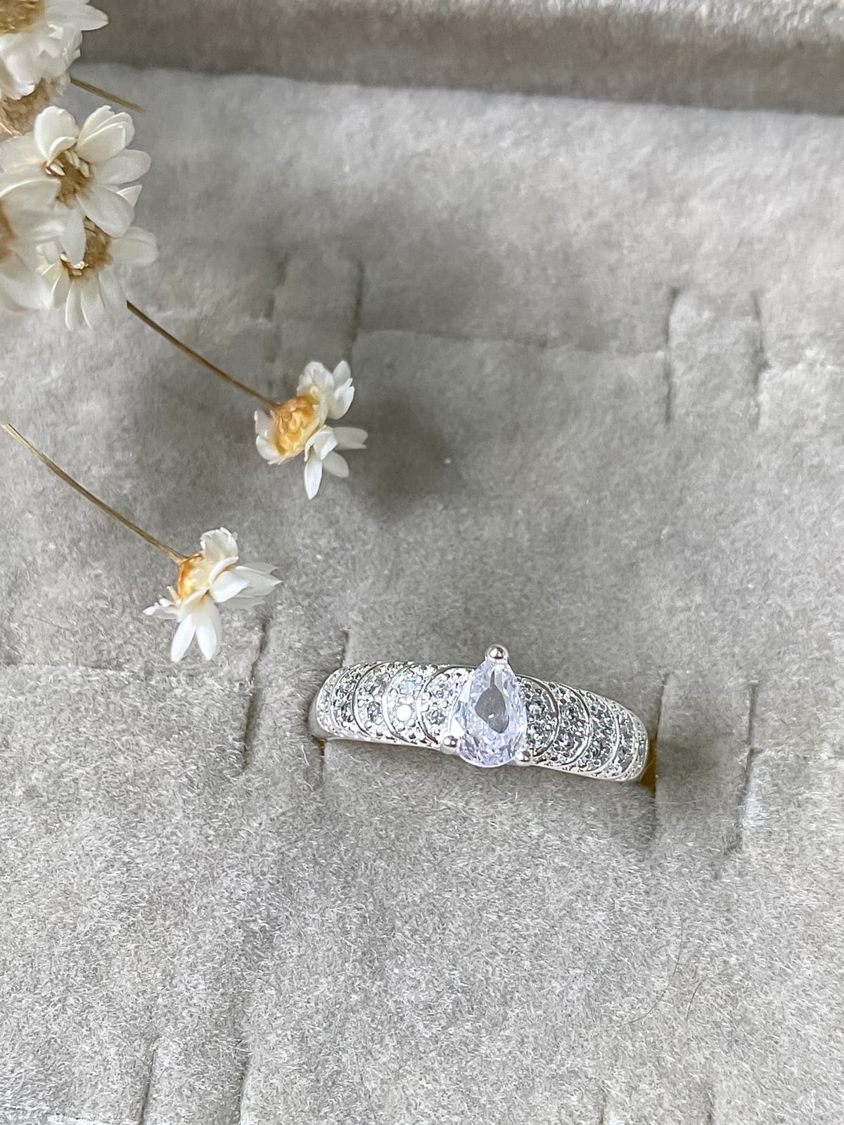 Anel com gota de zircônia central e escamas cravejadas em zircônias.