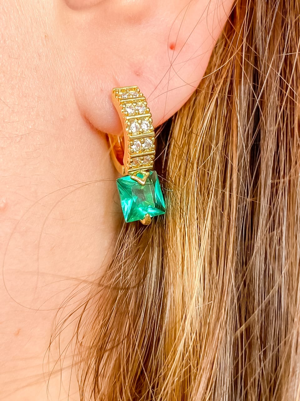 Brinco Argolinha Cravejado em Zircônias com Pedra Turmalina Quadrada