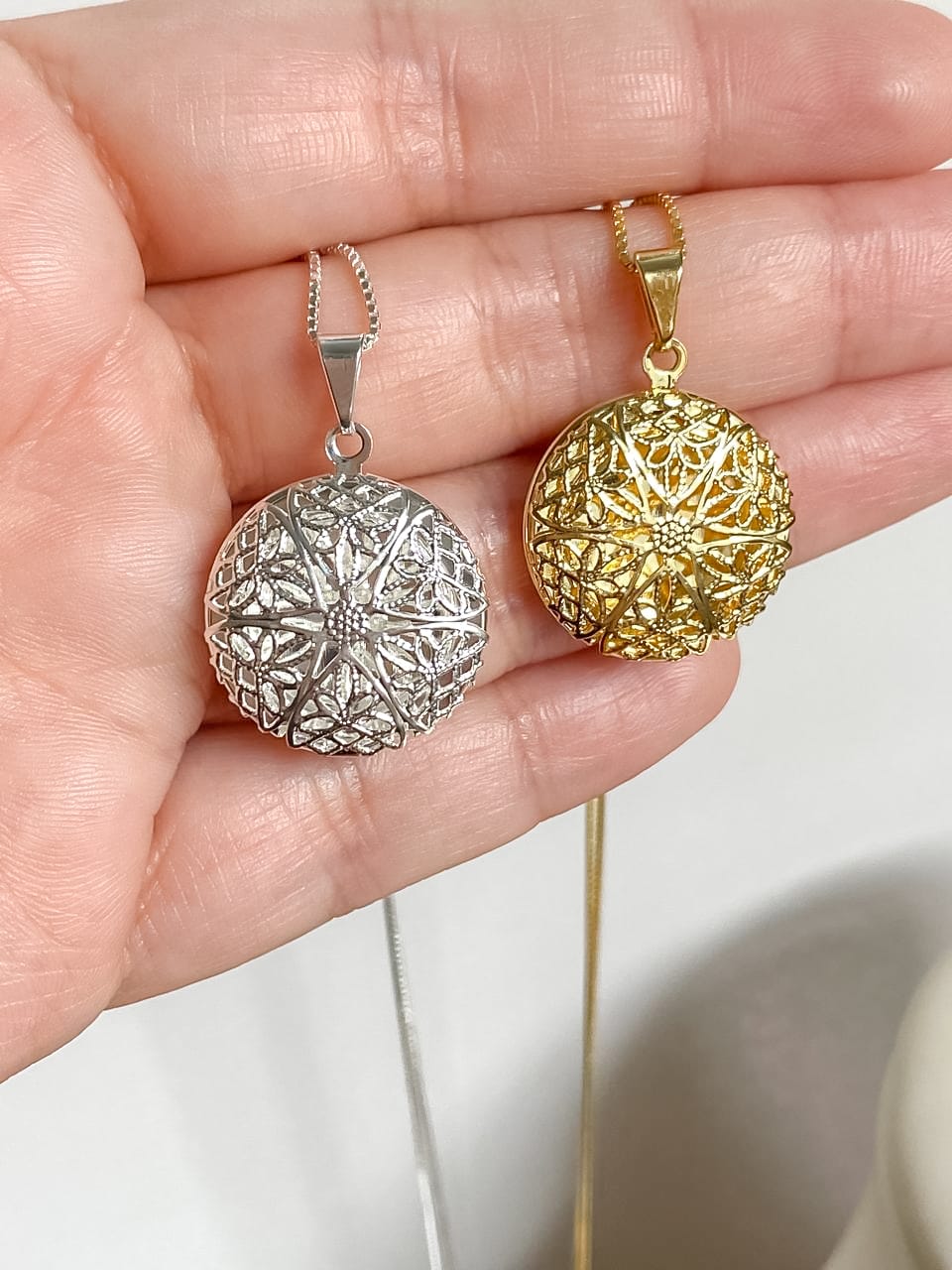 Colar Relicário Redondo Vazado com Estampa Banhado a ouro 18k